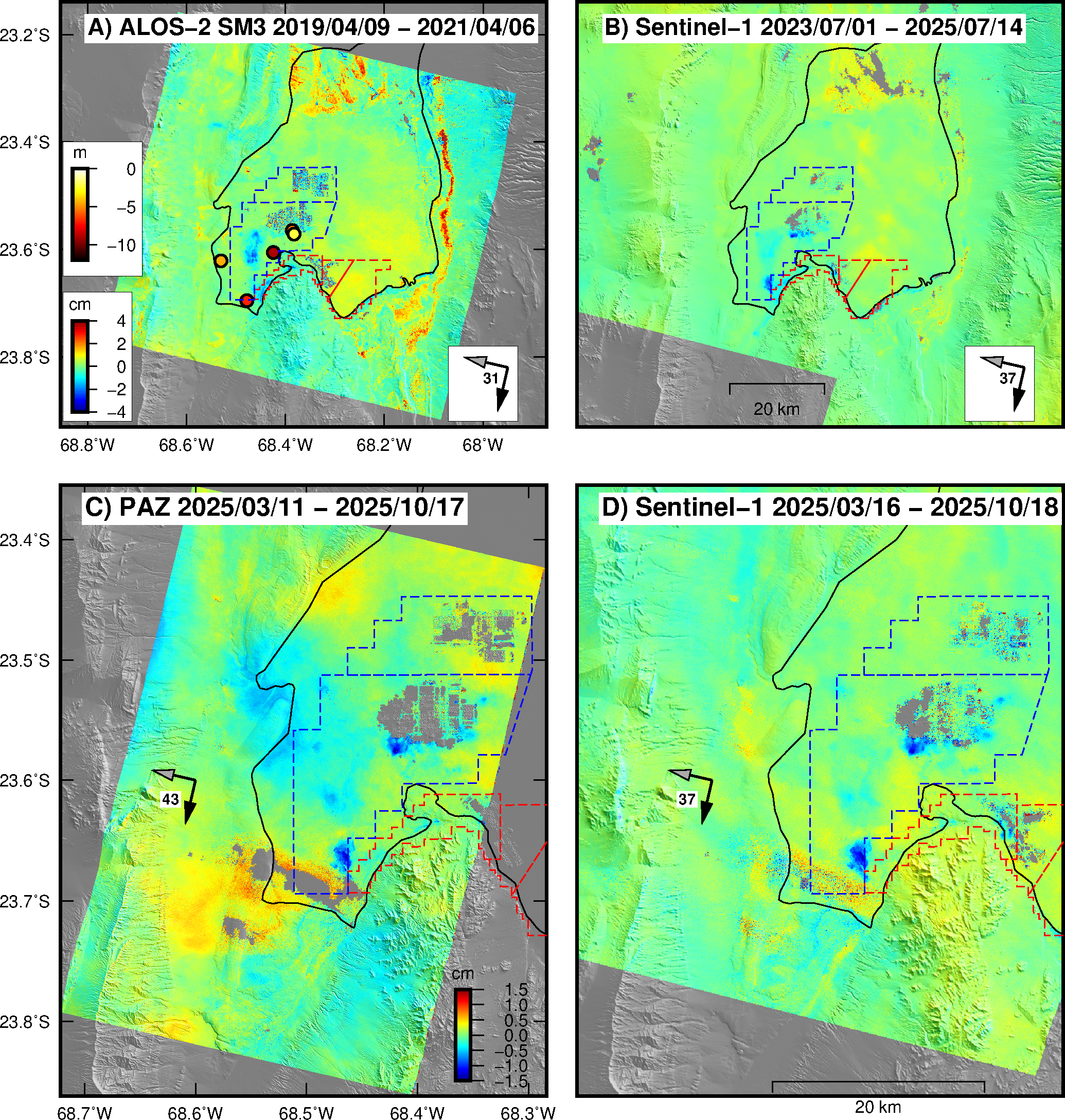ALOS-2 SM3 (A) and Sentinel-1 TOPS (B) interferograms that show ~2.5 and ~4 cm of line-of-sight (LOS) subsidence during mid 2019 to mid 2021 and mid 2023 to mid 2025 in the Salar de Atacama basin (dashed black line) Delgado et al., 2024. The subsidence results from a drop of ~10 m in the phreatic level in several wells due to brine extraction (yellow to red circles). The brine is extracted and then the water evaporated in plants in the middle of the salar. These plants are areas of very low coherence due to the continuous change of backscatering properties because of the presence of water. The LOS uplift in the SE and E parts (1 and 2 cm respectively) of the salar likely results from a combination of either salt growth and/or soil moisture changes in response to episodic rains triggered by the Andean monsoon. PAZ (C) and Sentinel-1 (D) interferograms that span nearly the same time span of seven months during 2025 and record ground subsidence of 1.5 cm in the SW region of the Salar.