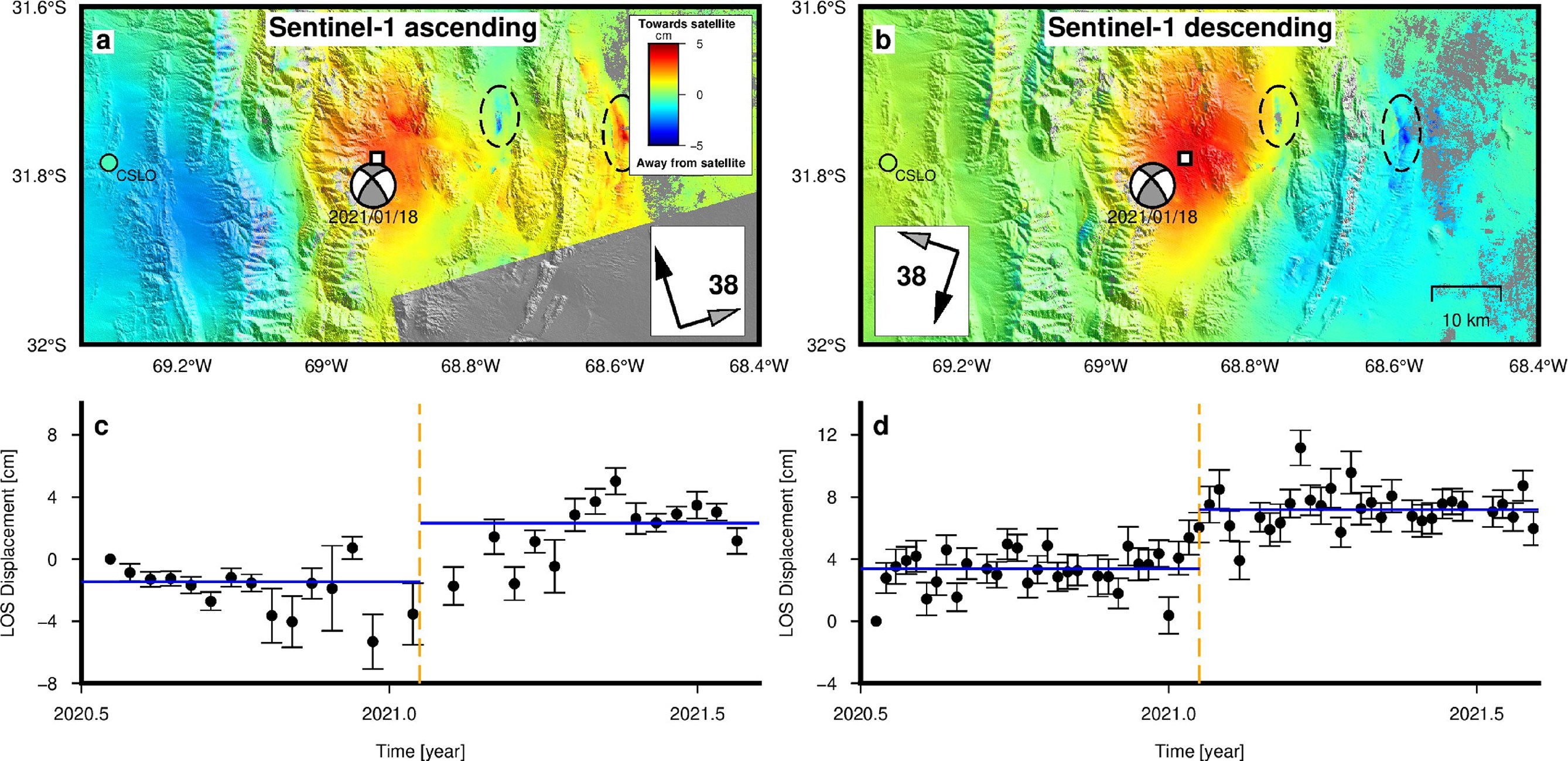 Reconstructed line-of-sight (LOS) ground displacement for ascending and descending tracks (a and b, respectively). White squares indicate the locations of maximum displacement, while dashed elipses highlight deformation unrelated to the main dislocation. Coloured circles represent the solution of CSLO GNSS station reported by Ammirati et al. (2022) projected to the respective LOS. Focal mechanism is also from Ammirati et al. (2022). Panels (c) and (d) show the Heaviside-like function fit to the maximum displacement data, with vertical dashed line representing the prescribed step at the earthquake date (León-Ibáñez and Delgado, 2025).