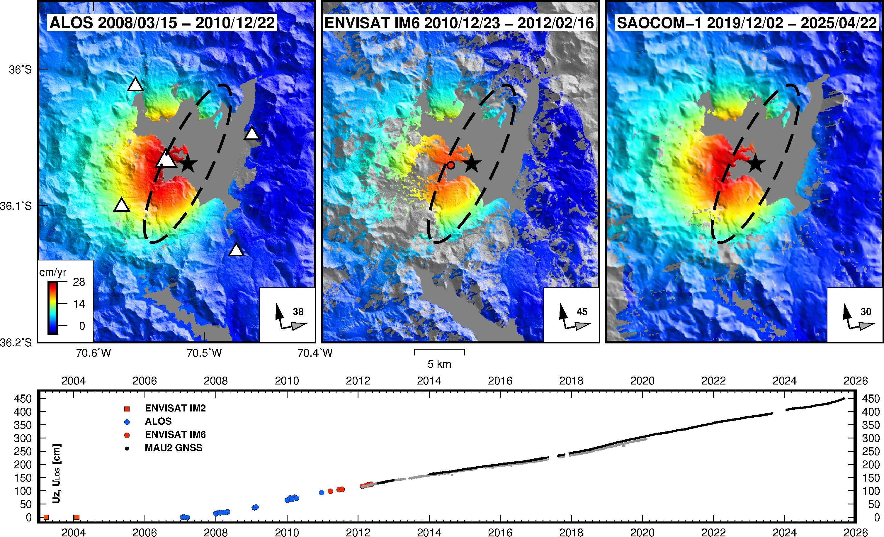 Laguna de Maule geodetic data. ALOS and SAOCOM-1 ascending interferograms converted to mean ground velocity dividing by their time span. ENVISAT IM6 velocity calculated from InSAR time series. Triangles are GNSS stations from OVDAS. Time series of ground deformation spanning 2003 to 2025 from ALOS (Le Mevel et al., 2021), ENVISAT IM6 data and from the MAU2 GNSS station (largest triangle in the ALOS interferogram). The ellpise and star are the best-fit prolate spheroid and its centroid that can model horizontal GNSS vectors (Le Mevel et al., 2021). From the upcoming third edition of the Encyclopedia of Volcanoes.