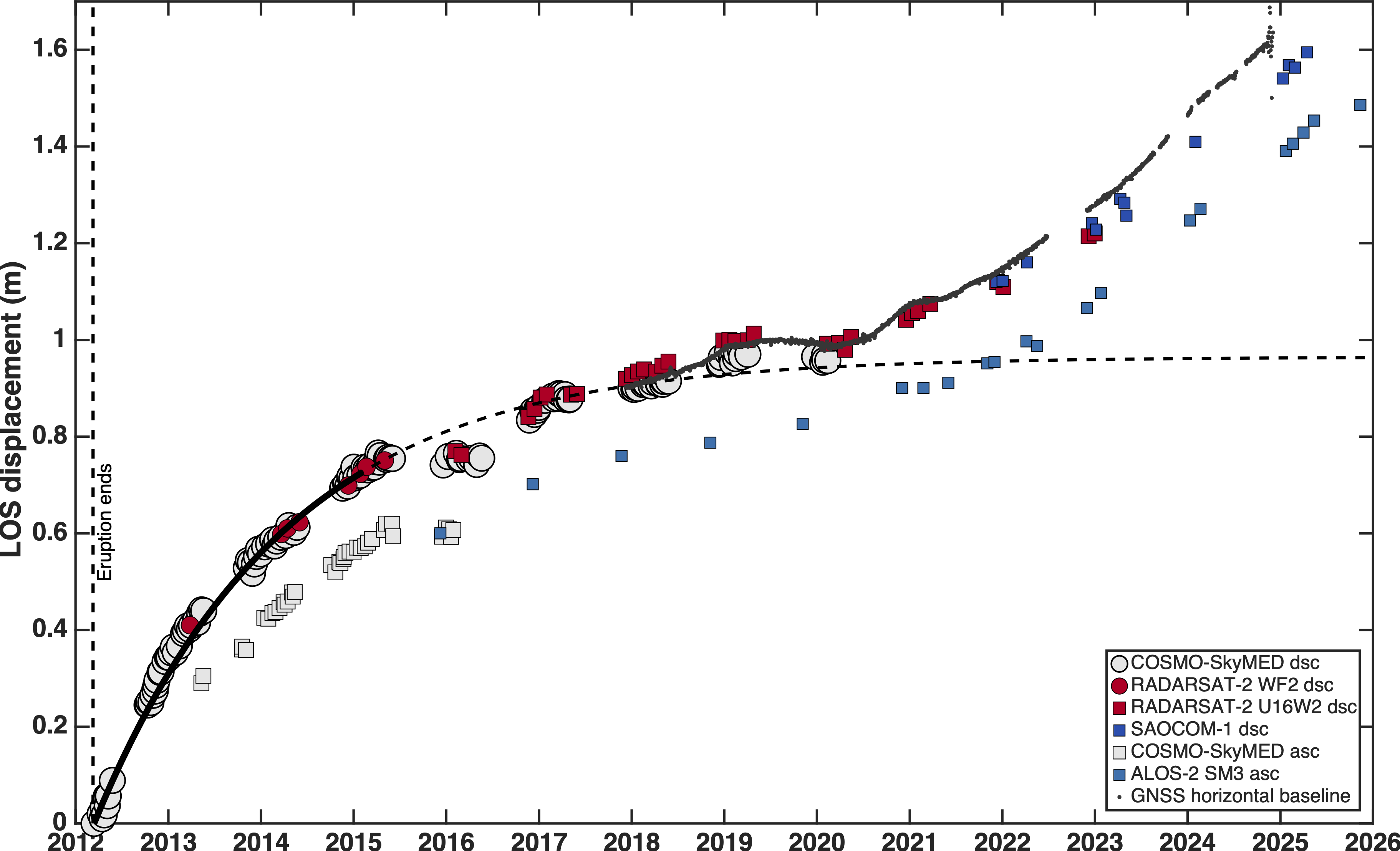 The black dots show the horizontal baseline change between two GPS stations in the volcano. The black line shows an exponential fit to the COSMO-SkyMED data during 2012-2015 and is strong evidence for a mechanism of magma injection in a shallow pressurized reservoir. Magma injection is likely responsible for the four pulses of ground uplift, although other mechanisms like viscoelastic relaxation and poroelastic mush extraction can also explain the deformation signals (Delgado et al., 2018; Phelps et al., 2023).